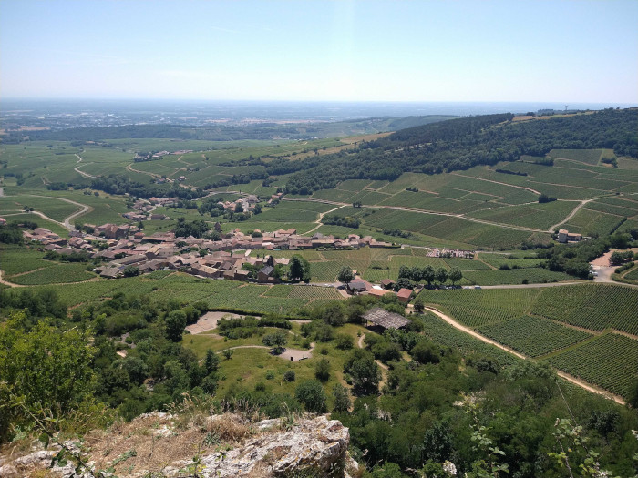 A bright and sunny morning greeted us when we headed out of town to the Rock of Solutré, a stunning limestone escarpment a few km from Mâcon. Although some of the supporters groups had already set off home, there were still plenty of us there to enjoy the hot sunshine and cool beers. Several headed to the prehistory museum, but I opted for the glorious panorama from the top of the rock. Just under 500m high, the rock affords a fantastic views across the Burgundy vineyards of Pouilly, Fuissé and other Mâconnais vignobles, and away to the east the Jura mountains were visible through the haze.