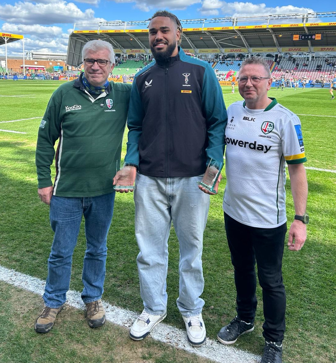 On Good Friday we battled the Easter weekend traffic and headed up to Frankin’s Gardens to make a presentation to our Player of the Season, Tom Pearson. We were delighted that fellow Exiles Tarek Haffar and Chunya Munga were able to join us pitch side for the occasion.