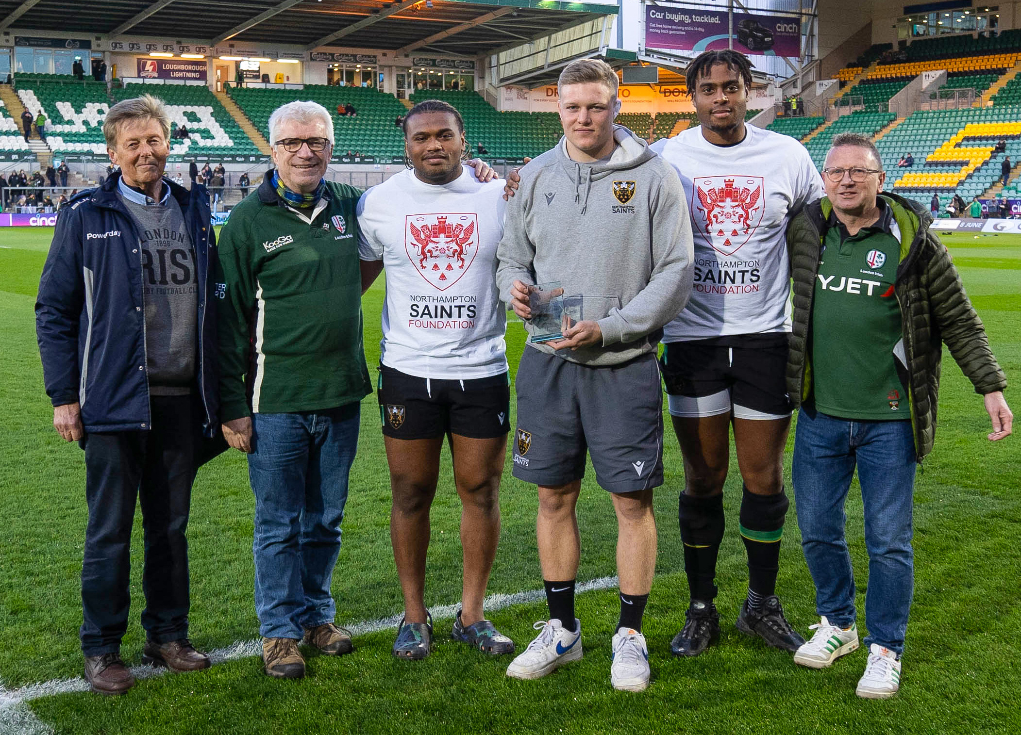 We were given a warm welcome by both the Northampton Saints Supporters Club and the rugby club. We are indebted to Kirstie Blencowe of the supporters club and communications director Jack Miller for their assistance in arranging the presentation, including their photographer and announcer, as well as negotiating with DoR Phil Dowson to get some pre-match time with Tom, Tarek and Chunya.