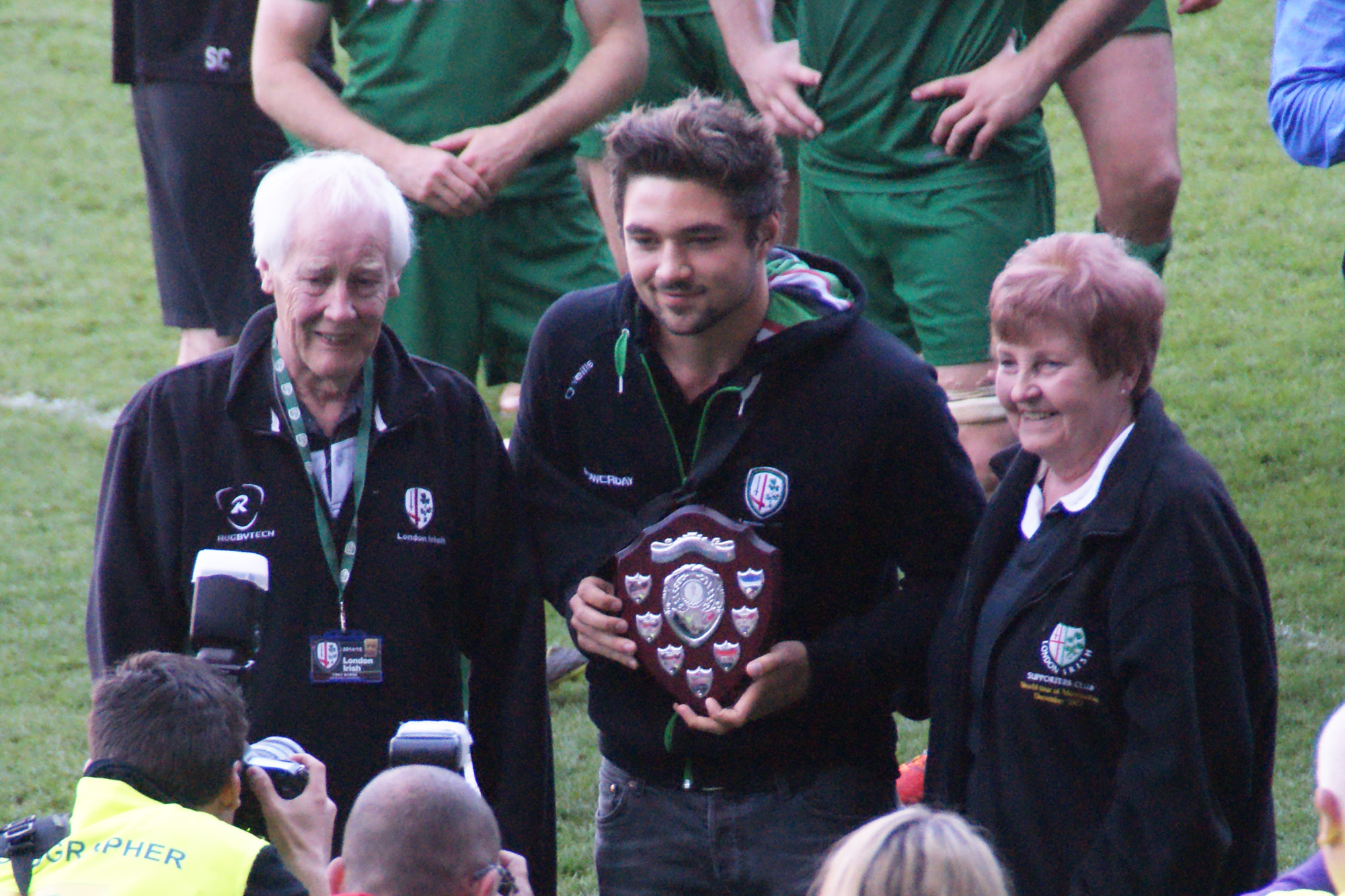 Following our last home match of the 2014-15 season presentations were made to the London Irish Supporters Club Player of the Season as voted for by the LISC membership, the St Clare’s Travel award to the Young Player of the Season presented by Tony and Maureen Byrne of St Clare’s Travel, and the Robin Clive Memorial Trophy (Academy Player of the Season) as chosen by the Academy coaching staff.